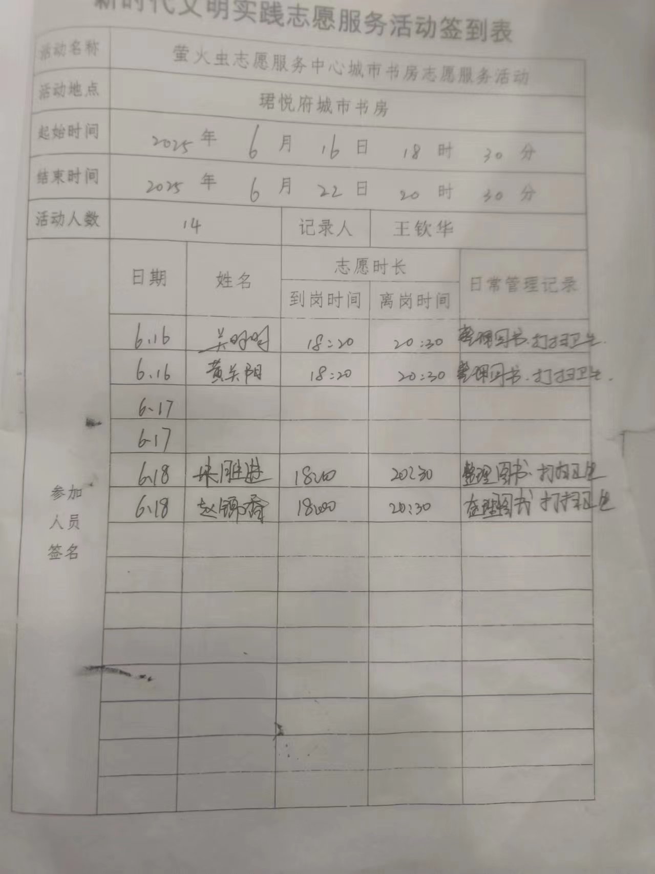 城市书房是国家提倡的全民阅读活动的延伸,是提升基层文化设施服务效能,实现城市公共文化服务品质化提升的文化工程,萤火虫志愿服务活动中心积极响应区委宣传部、团委、文旅局号召,积极参加书房活动,为打造全区文化新地标做出自己的贡献。活动要求:1、参加活动仅限本组织成员,须统一穿萤火虫队服。2、志愿者报名须先在大群里扫码进小群接龙,接龙完成后才能在(志愿山东或文登首发)上报名参加活动。3、提前10分钟到达书房,不迟到,不早退。4、每天仅限两位志愿者参加活动。5、请认真仔细填写值班表。6、活动结束后请关好门窗和电器设备。7、往返路上注意安全,参加活动的志愿者默认萤火虫志愿服务中心免责声明。