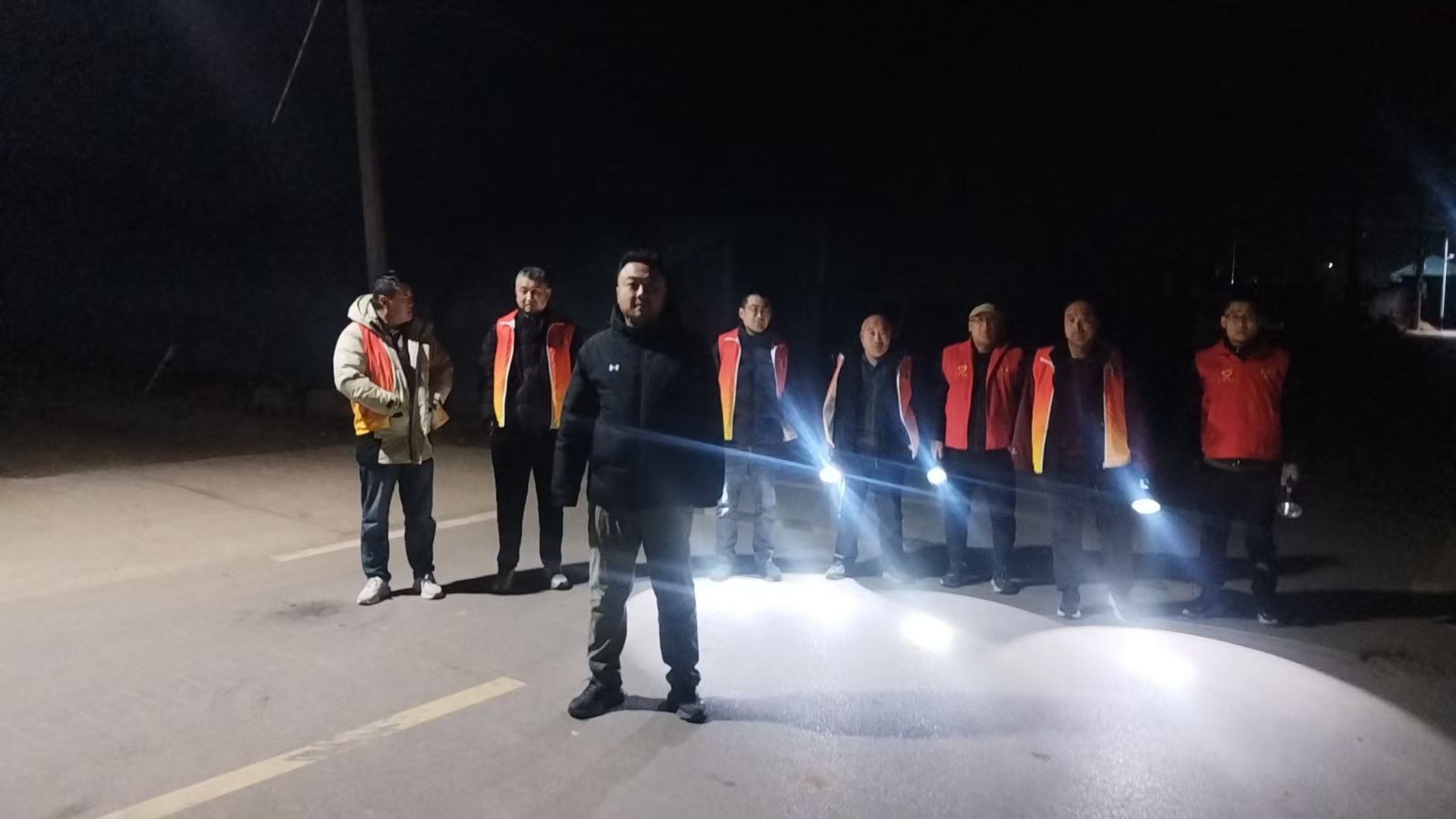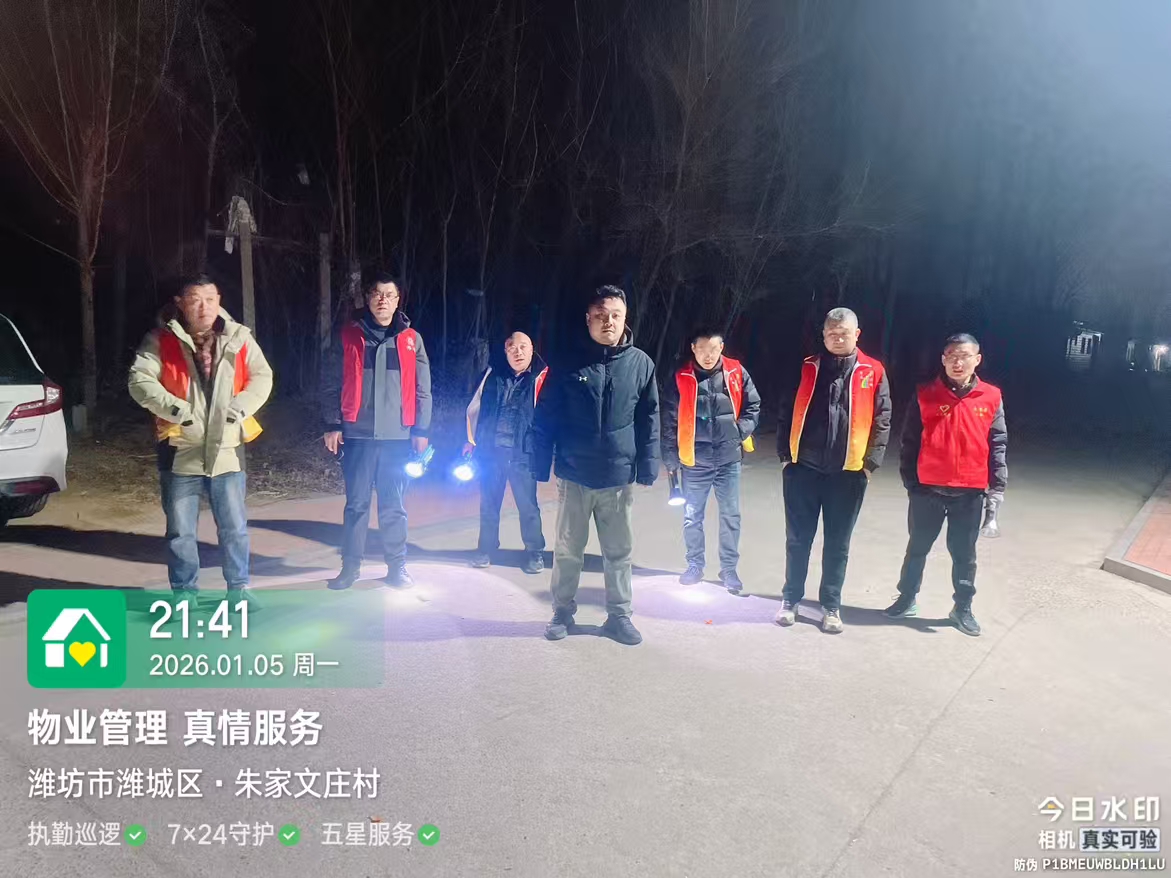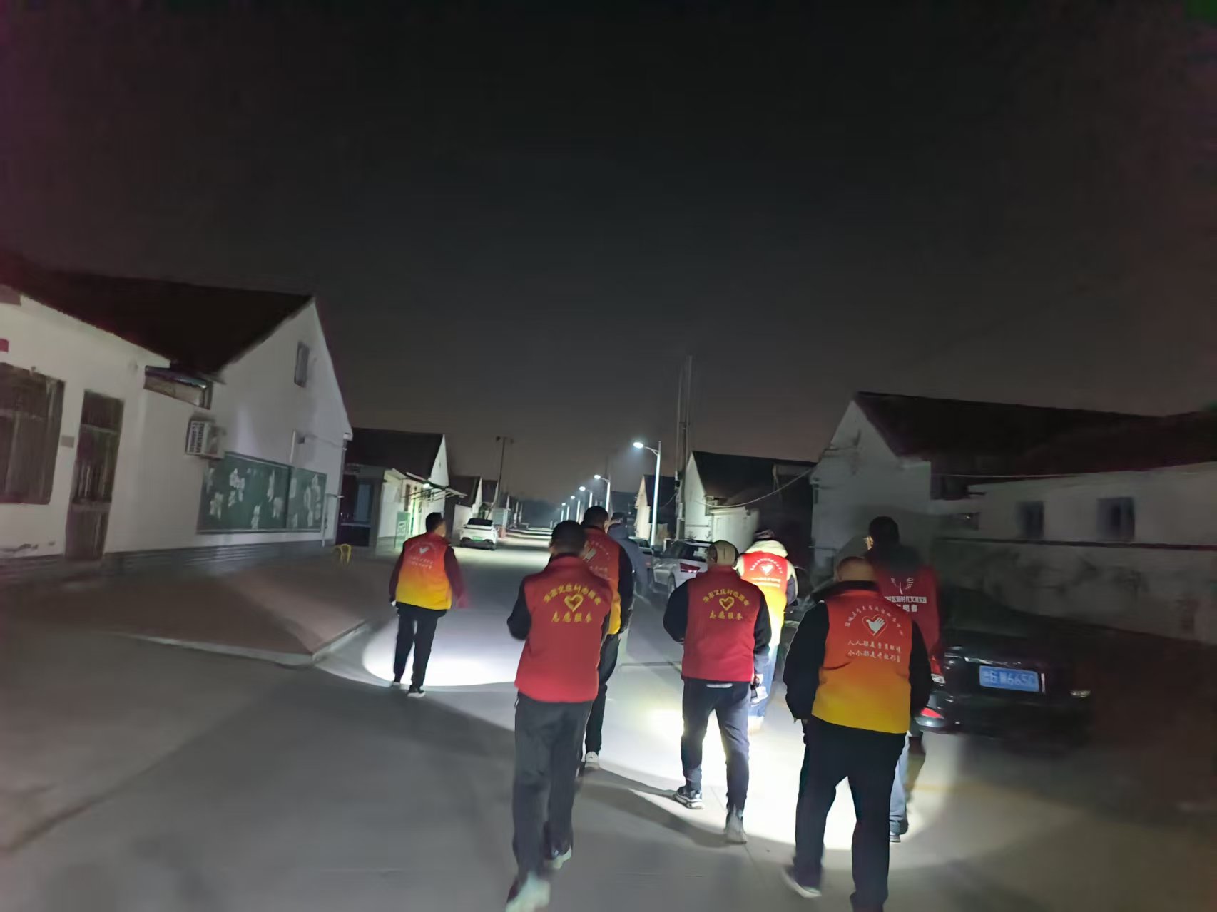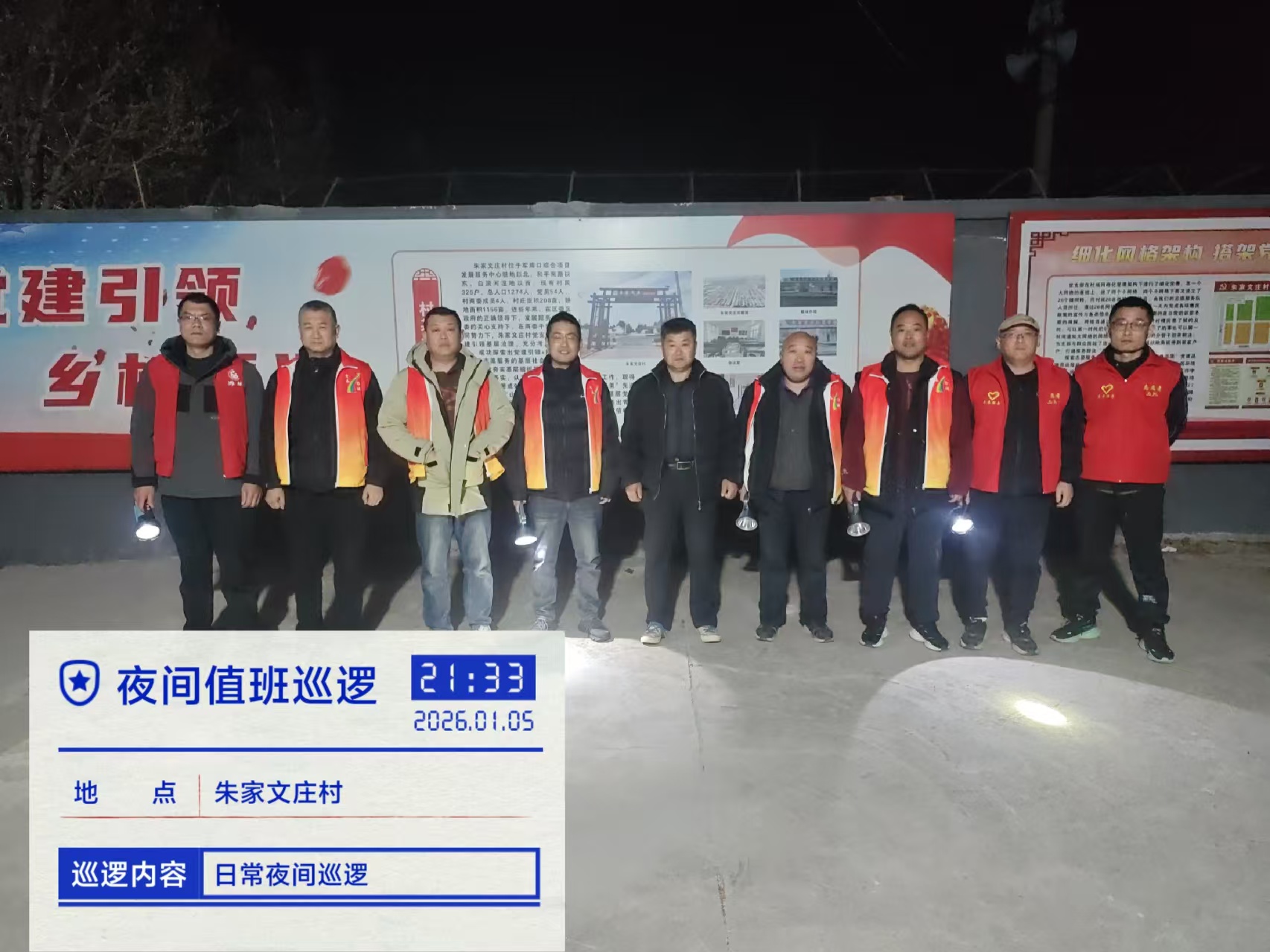 19:30-22:30朱家文庄村志愿服务队组织志愿者参与夜间值班巡逻活动,保障村民的财产和生命安全。