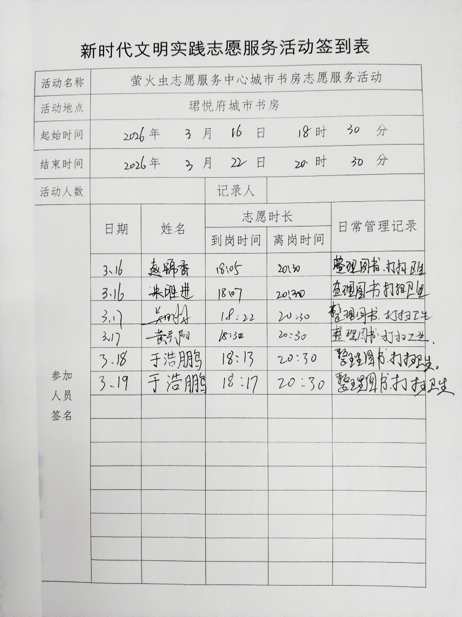 活动要求:1、参加活动仅限本组织成员,须统一穿萤火虫队服。2、志愿者报名须先在大群里扫码进小群接龙,接龙完成后才能在《山东文明实践》网站上报名参加活动。3、提前10分钟到达书房,不迟到,不早退。4、每天仅限两位志愿者参加活动。5、请认真仔细填写值班表。6、活动结束后请关好门窗和电器设备。7、往返路上注意安全,参加活动的志愿者默认萤火虫志愿服务中心免责声明。