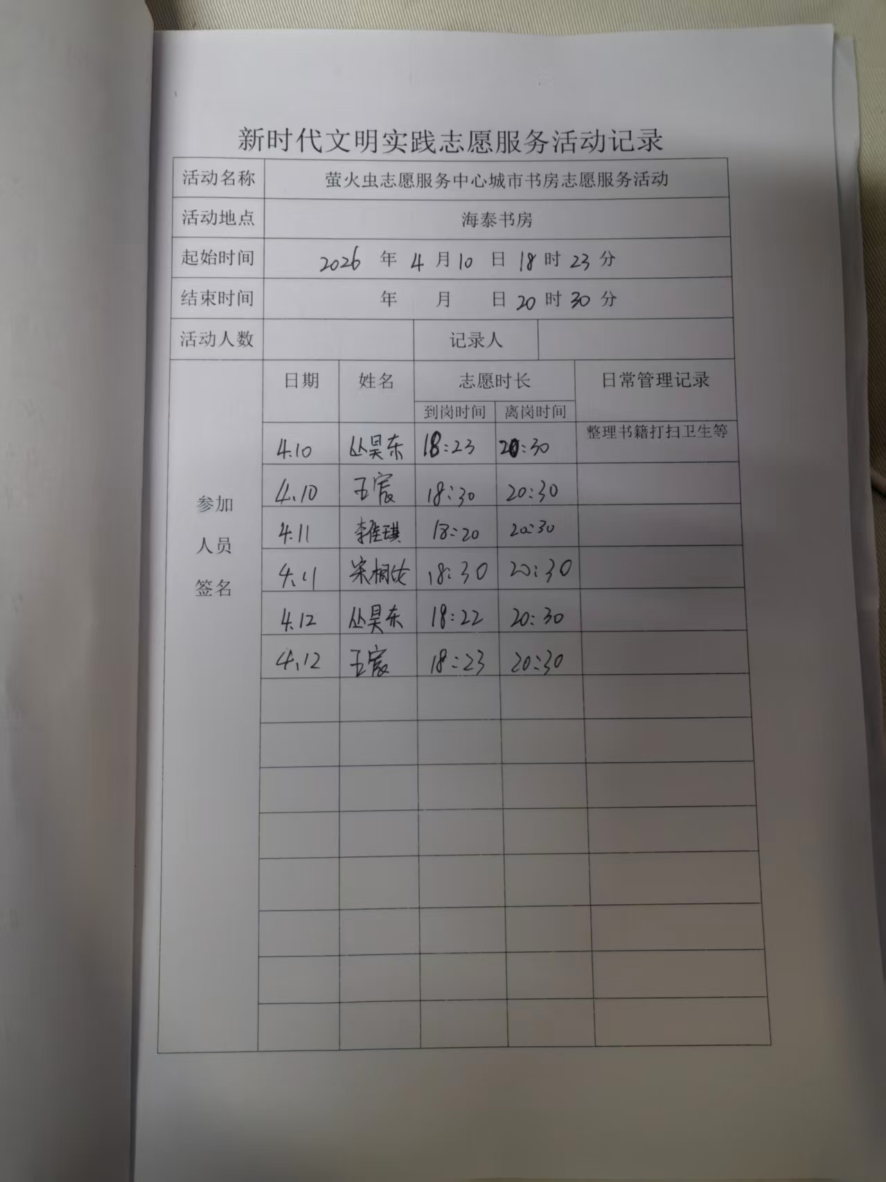 4.12晚上(海泰庄园书房)萤火虫志愿组织书房志愿服务活动