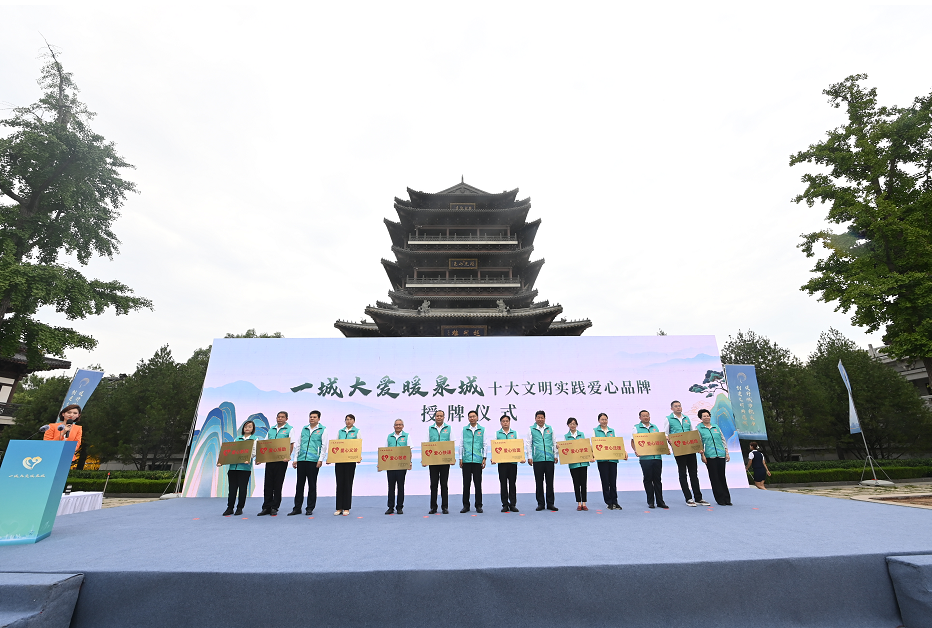 济南市委常委、宣传部部长戴龙成,济南市人大常委会副主任黄贵利,济南市副市长韩伟,济南市政协副主席刘勤为“一城大爱暖泉城”十大文明实践爱心品牌授牌。