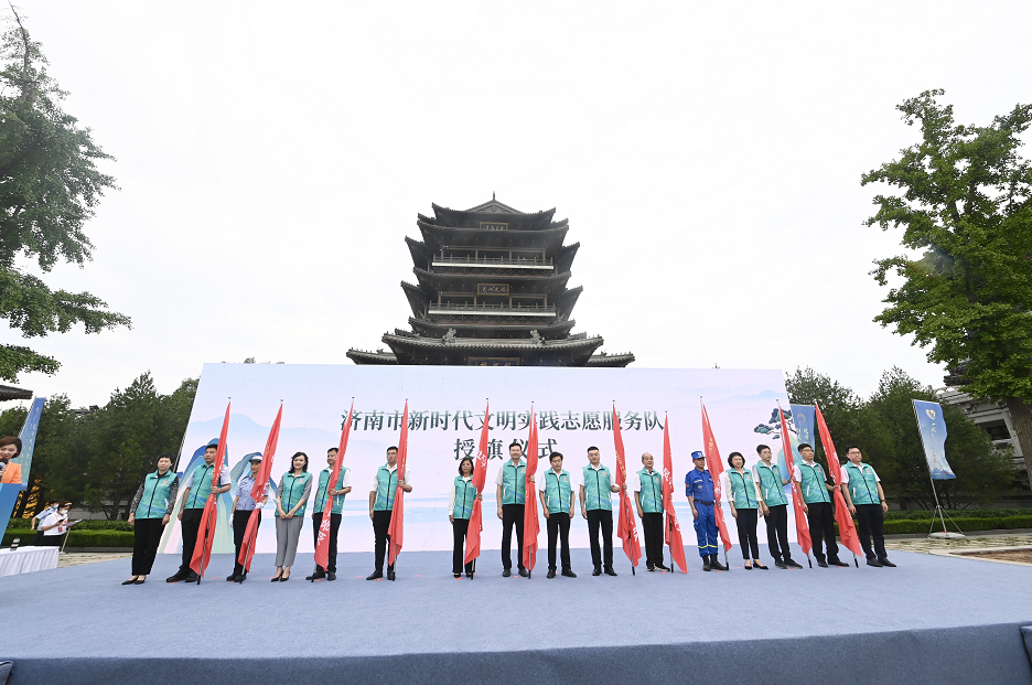 济南市新时代文明实践服务总队副总队长孙世会、尹红梅、马利、张熙、苏楠为济南市22支志愿服务队伍代表授旗。