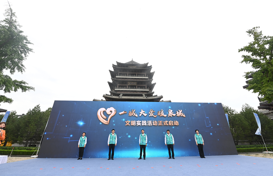 济南市委常委、宣传部部长戴龙成,济南市人大常委会副主任黄贵利,济南市副市长韩伟,济南市政协副主席刘勤,志愿者代表佀雪玲共同启动“一城大爱暖泉城”文明实践活动。