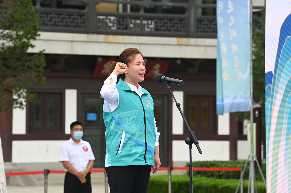 全国疫情防控最美志愿者,济南市新时代文明实践志愿者代表佀雪玲上台领誓。