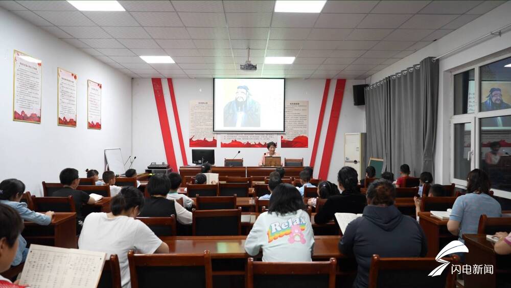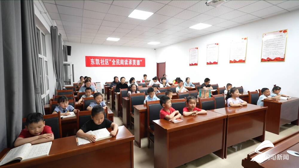 在东营经济技术开发区东凯社区党群服务中心,孩子们正跟着国学老师诵读国学经典、学习文明礼仪。