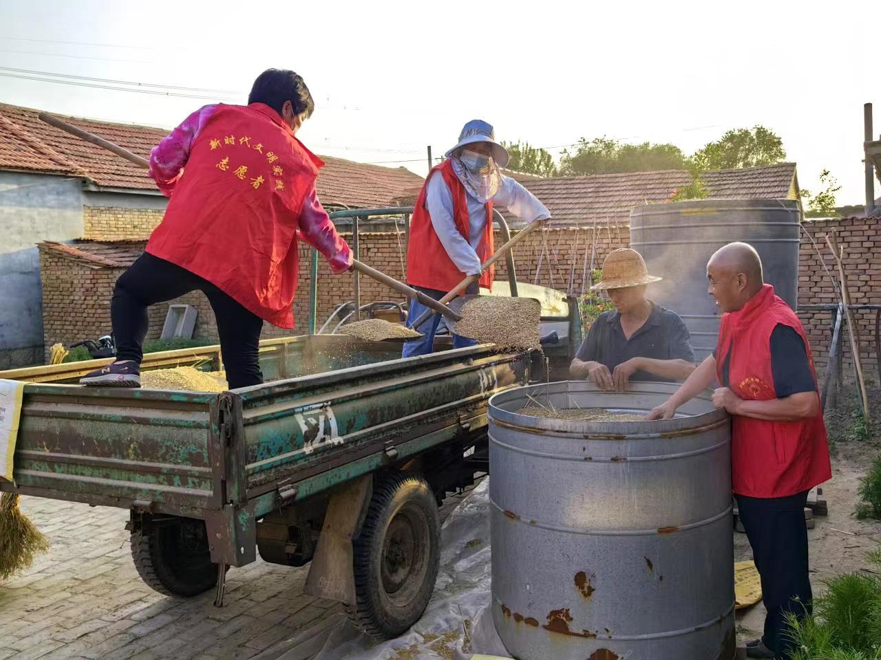 今年67岁的郑玉贵,患病多年丧失劳动能力,老伴常年瘫痪在床,唯一的女儿也不在身边,麦收问题让郑玉贵一直犯愁。了解情况后,村里“三夏志愿服务队”的几名党员带着收割机械来到郑玉贵的地里,帮助他收割小麦,很快,郑玉贵5亩多地的小麦就运送到家了。在麦收期间,村里梳理出在夏收夏种过程中存在困难的6户群众作为重点帮扶对象,成立了15人的党员干部志愿服务队,帮助他们抢收抢种,解决他们的后顾之忧。