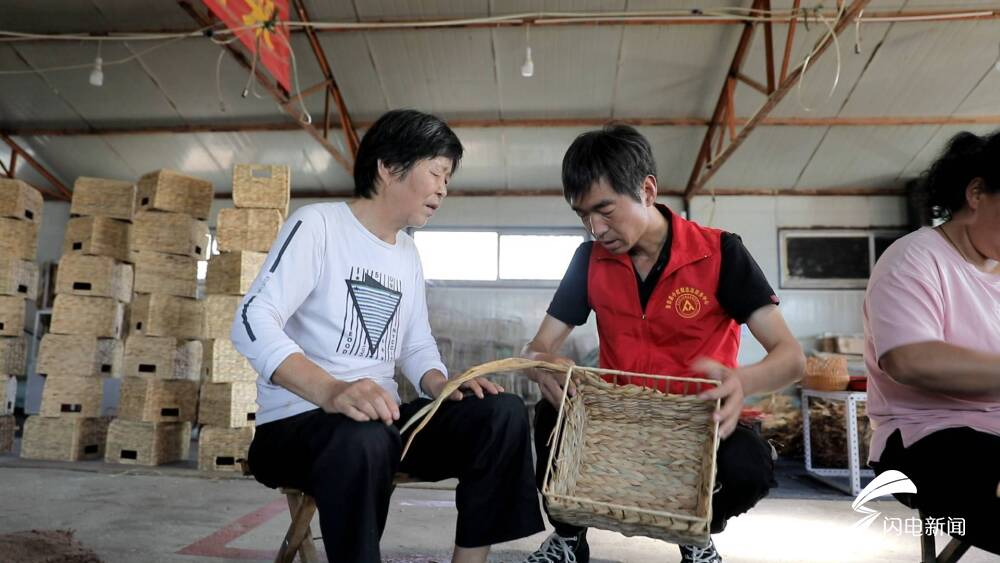 在鱼台县老砦镇许楼村的初心手工编织车间,村民们正在用葫芦草编织收纳筐。